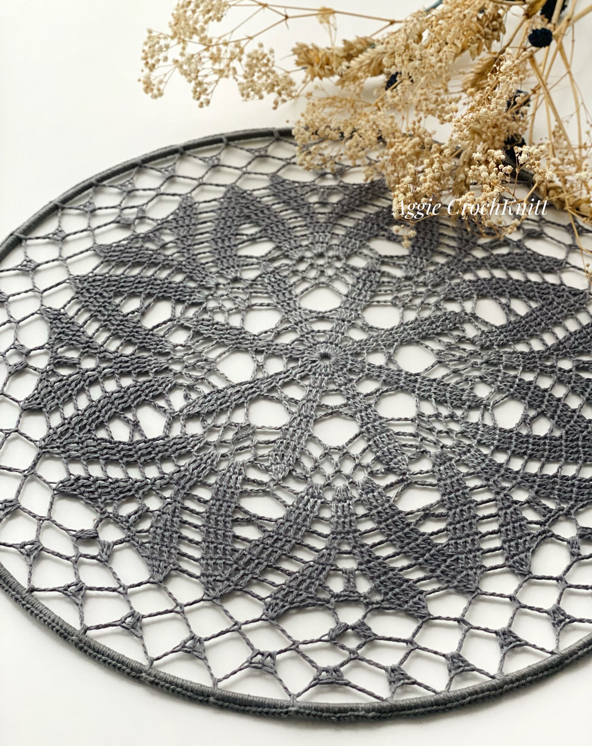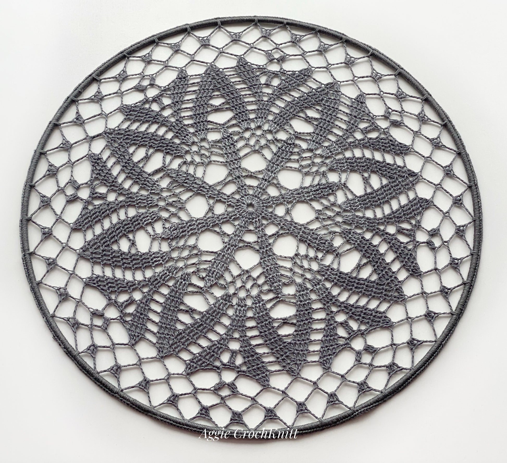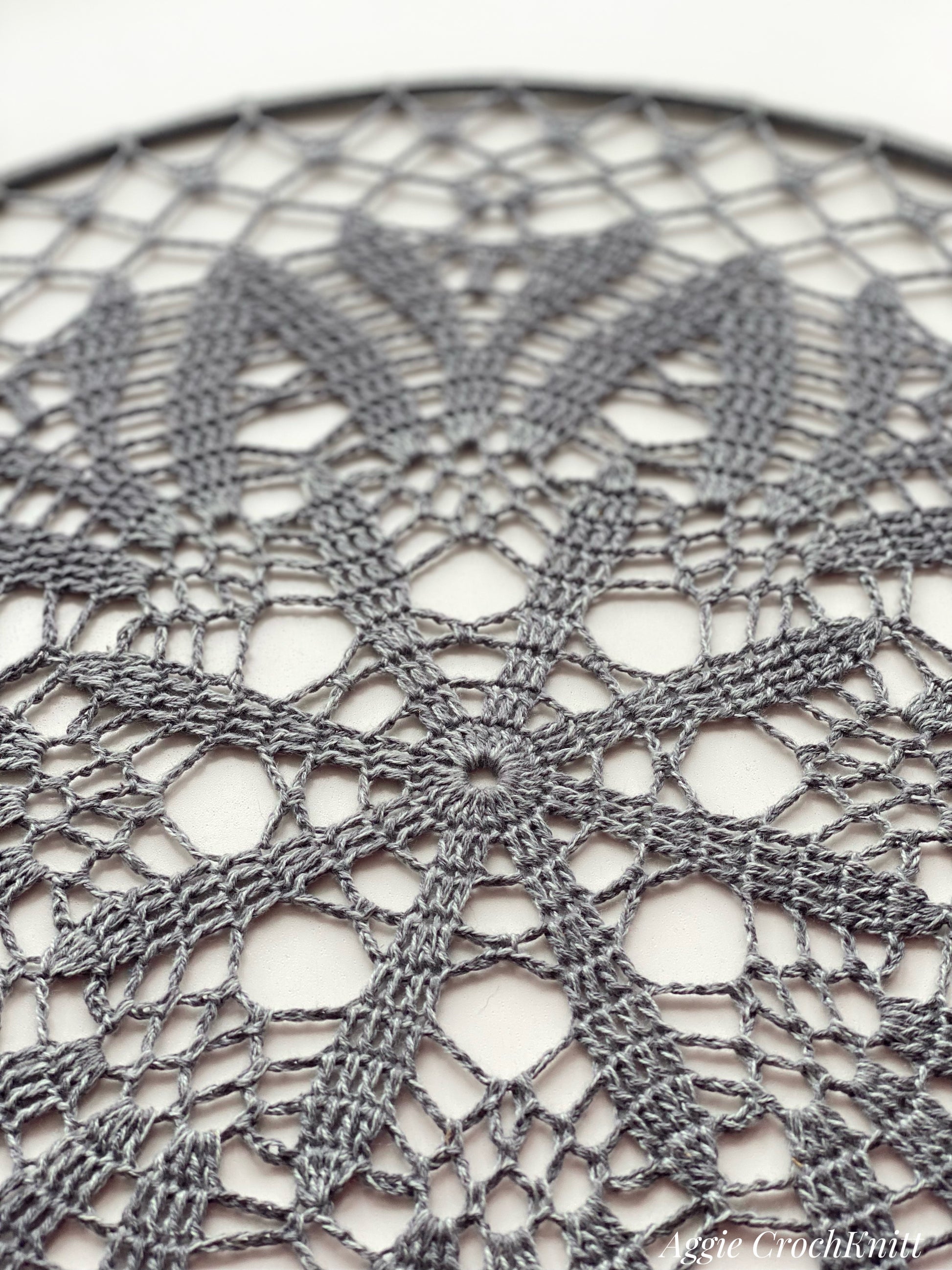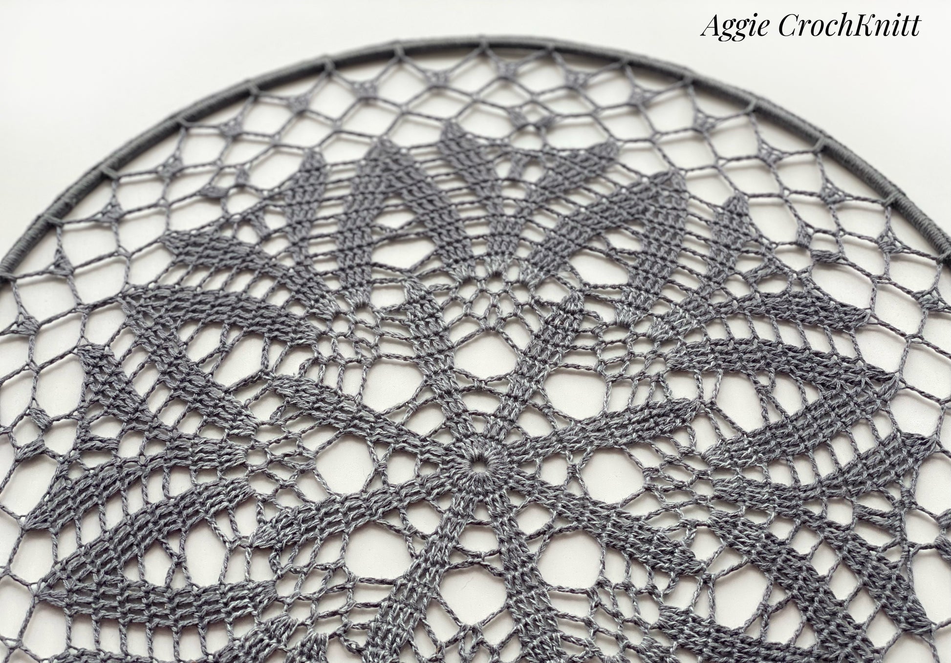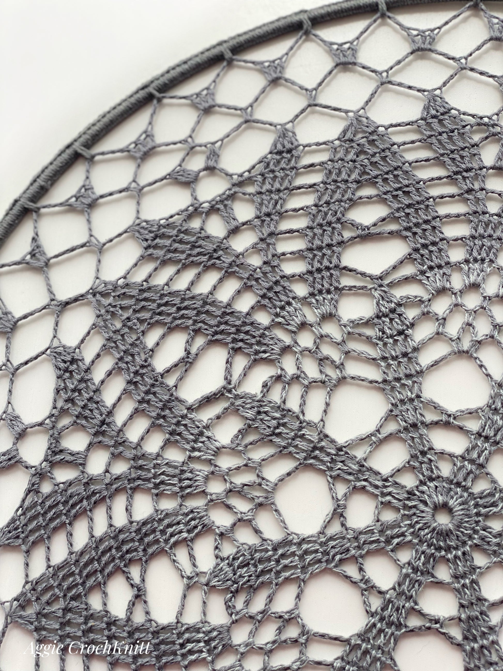 The hoop is metal and is wrapped in dark grey cotton to compliment the mandala by making a subtle frame for the crochet.