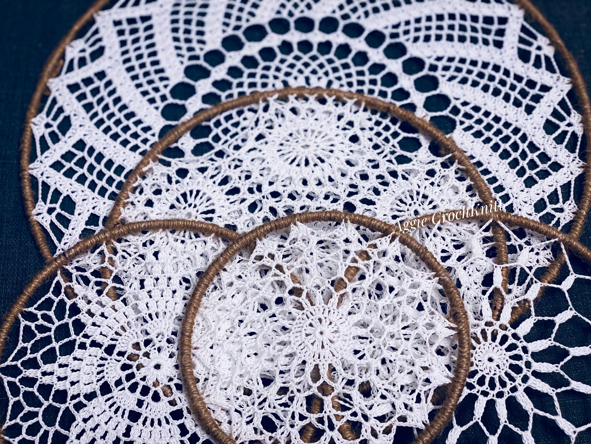 The doilies in the hoop are made of white cotton thread and the whole is finished with a jute rope.