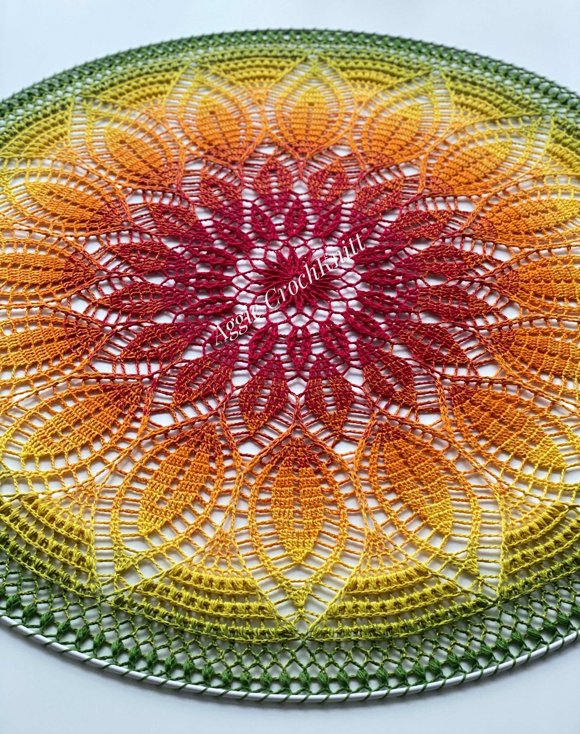 The hoop is metal and is wrapped in cotton to compliment the mandala by making a subtle frame for the crochet.