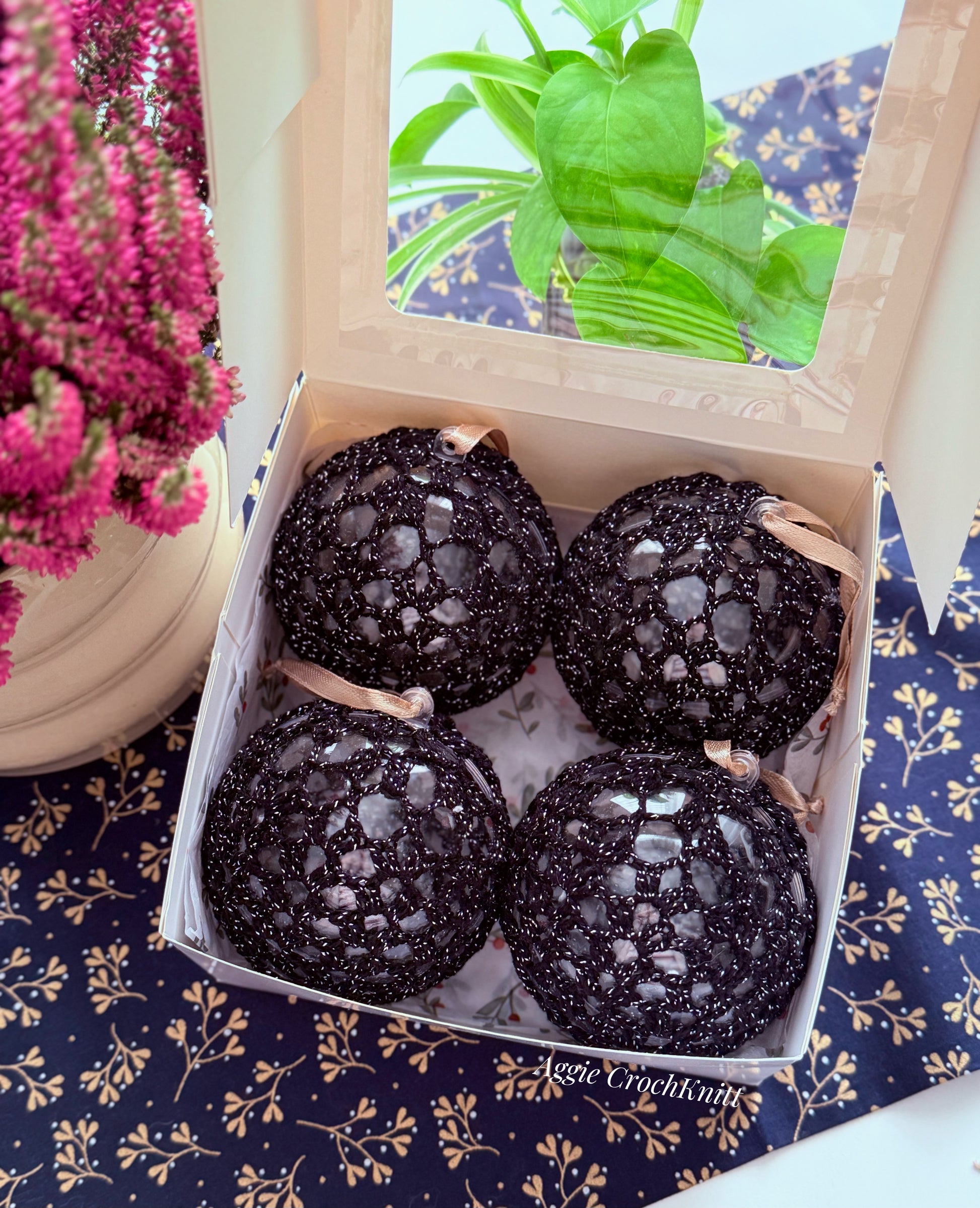 Set of 4 handmade crochet black with shiny thread bauble.
