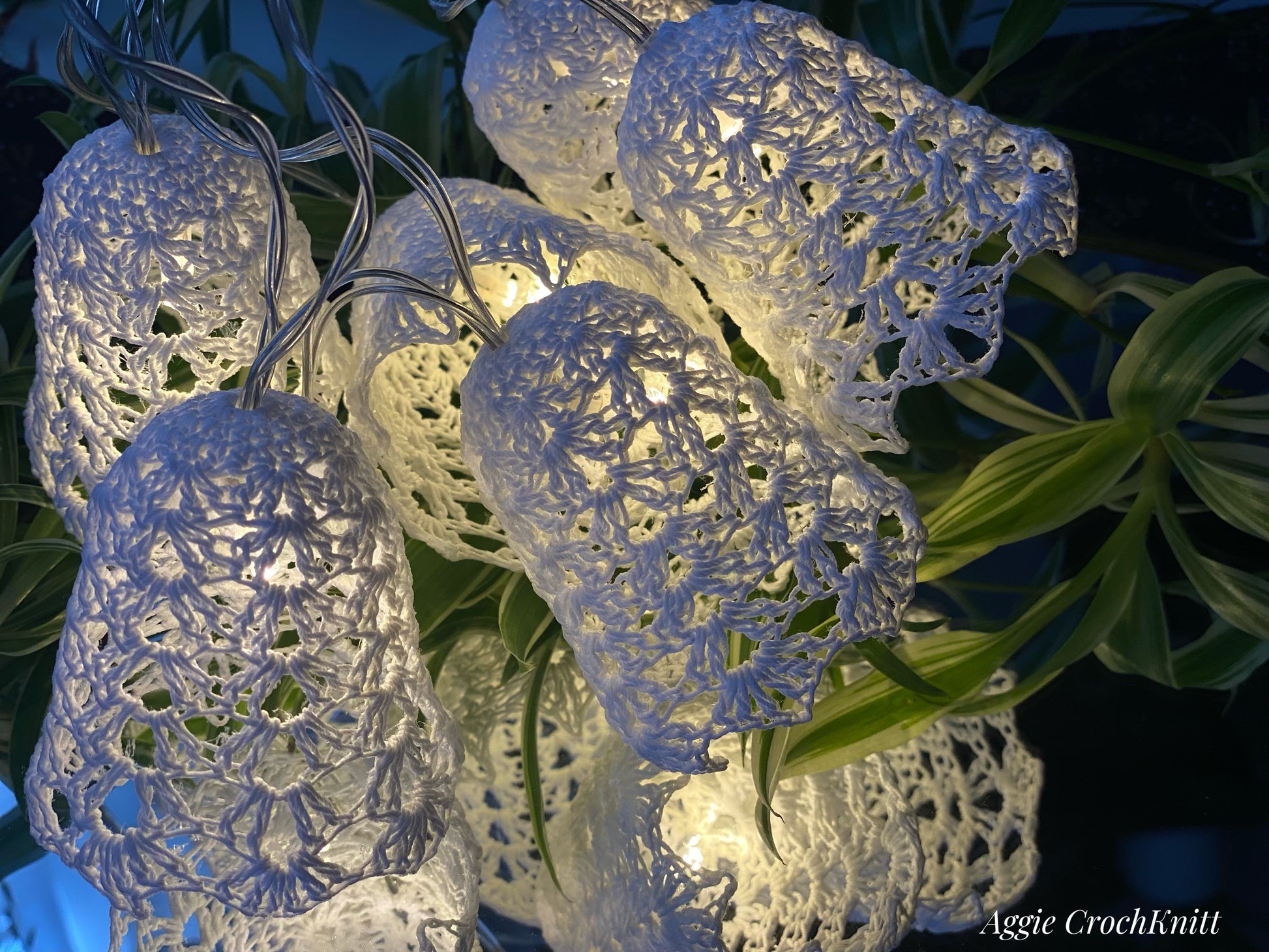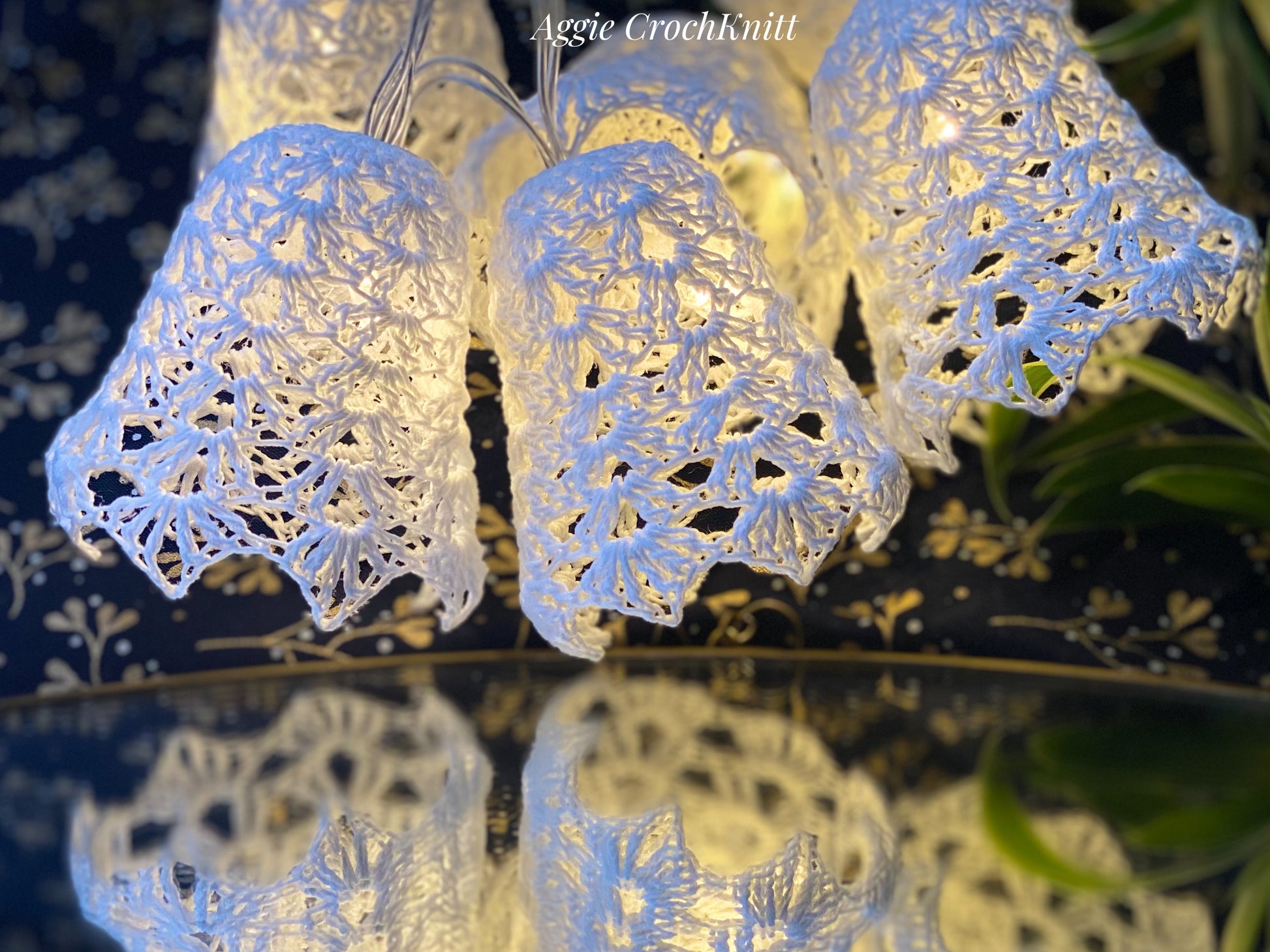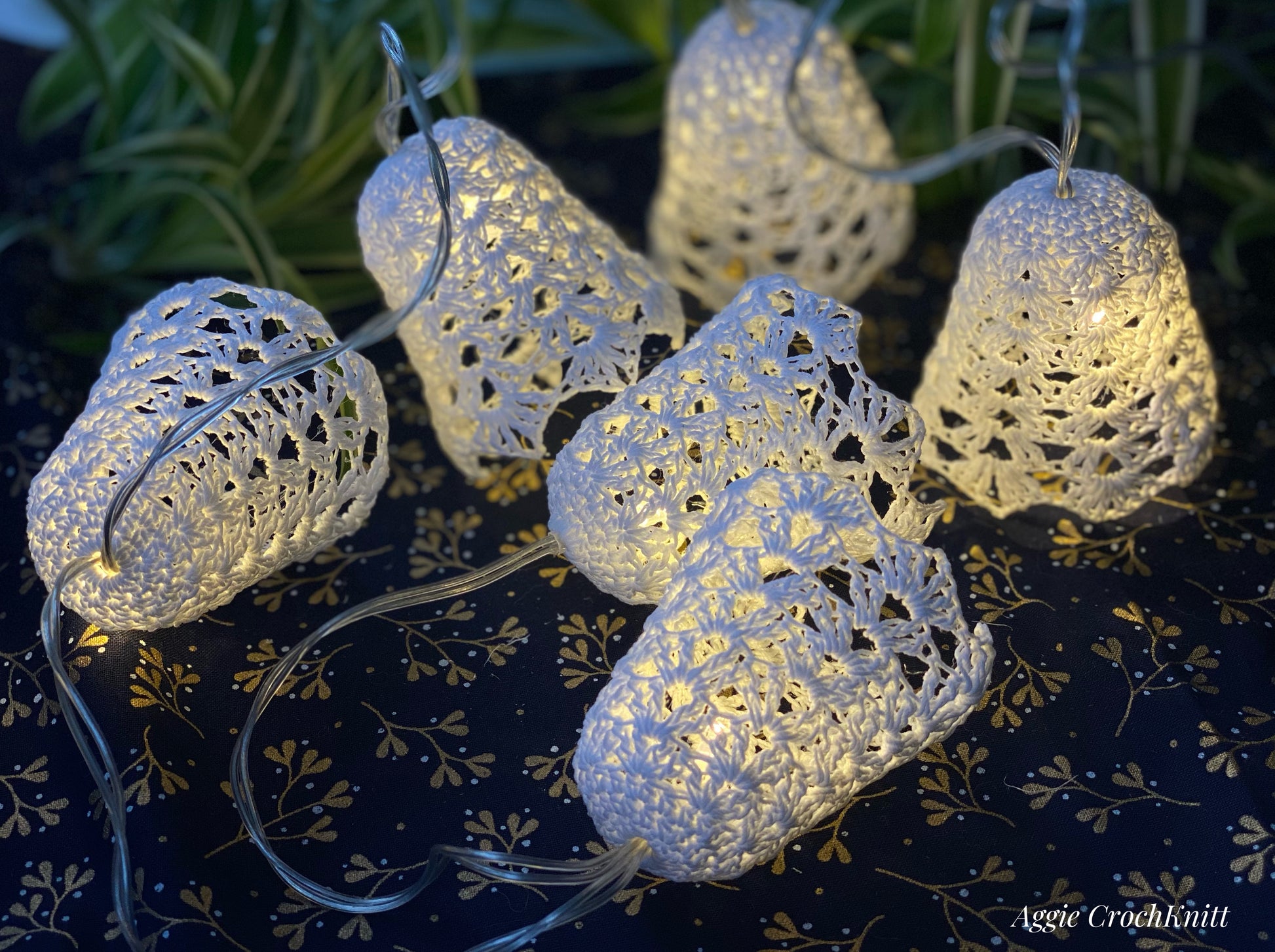Christmas garland - 6 crochet bells suspended on warm white lights.