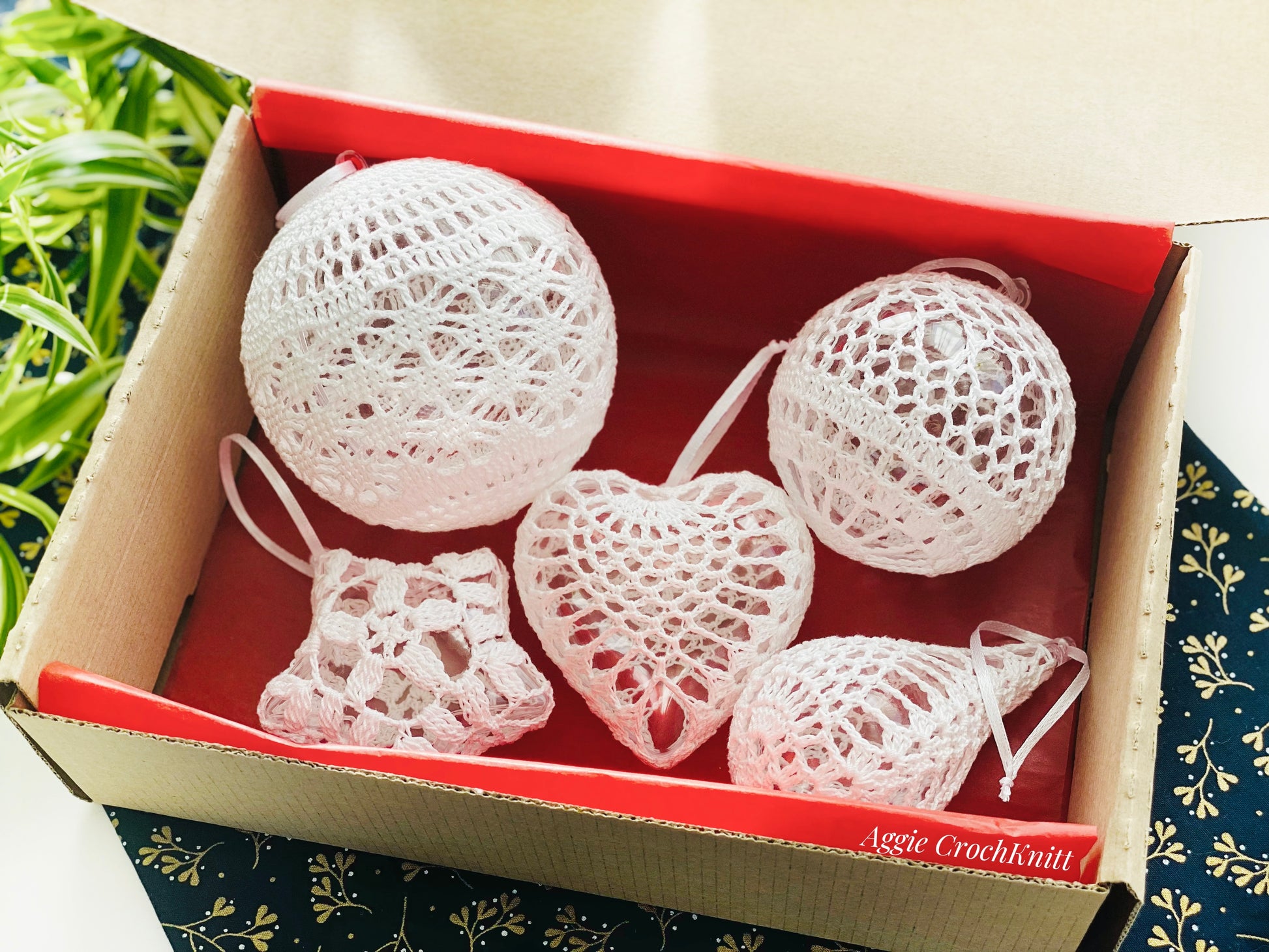The set includes: bauble 10cm, bauble 8cm, heart bauble, star bauble and water drop bauble